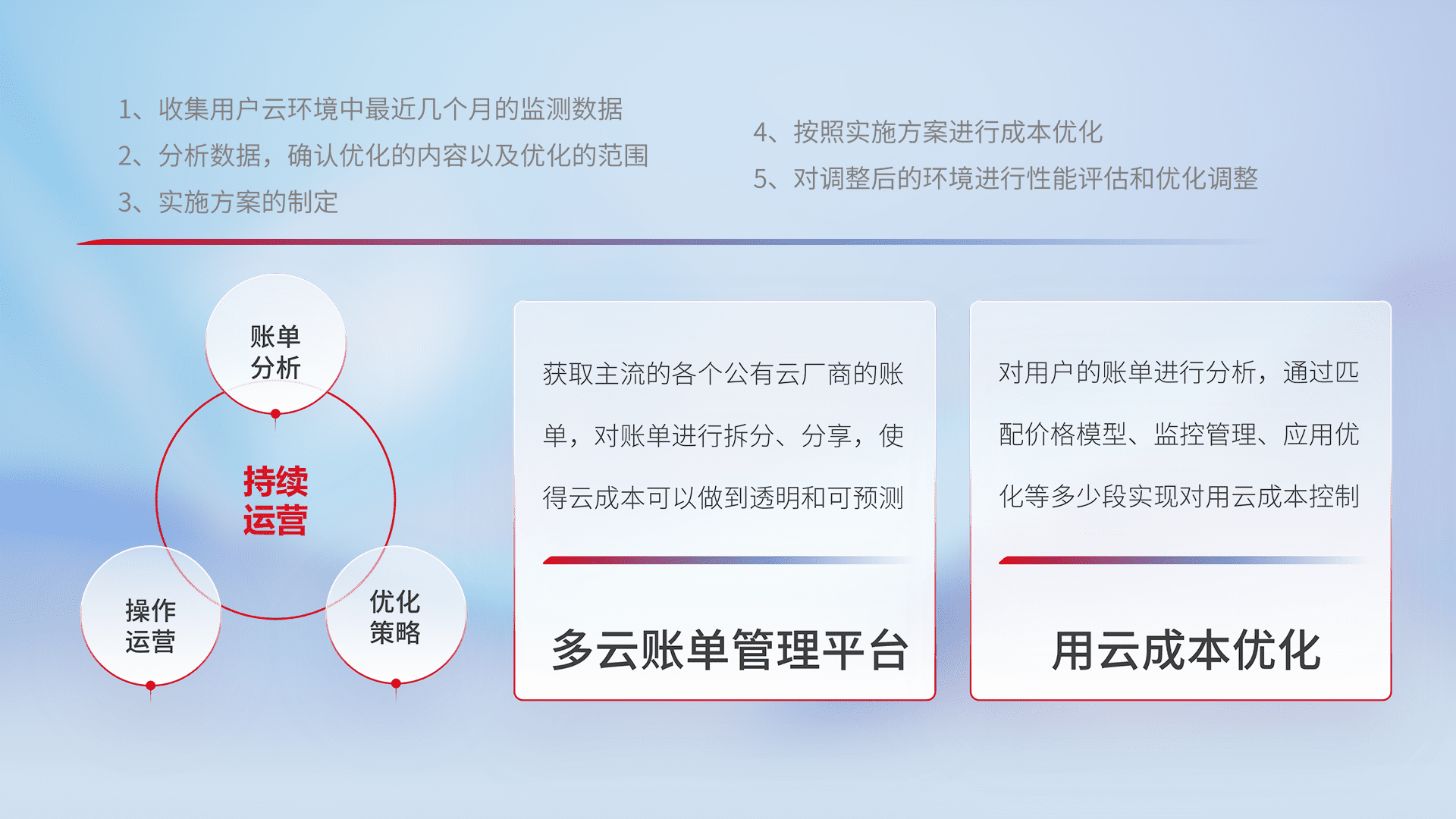 通过多云纳管,,,以统一的资源数据模型把客户的云资源进行抽象和封装,,,进而实现对多云资源的统一操作,,保障云资源管理的可靠性、、稳定性与可用性。。。量身定制化运维内容,,配置、、开发运维、、、补丁管理、、、、备份、、、监控、、、认证和访问管理、、审计和日常巡检等,,,,保障在用云过程中的可靠度,,稳定度以及高可用率。。。。