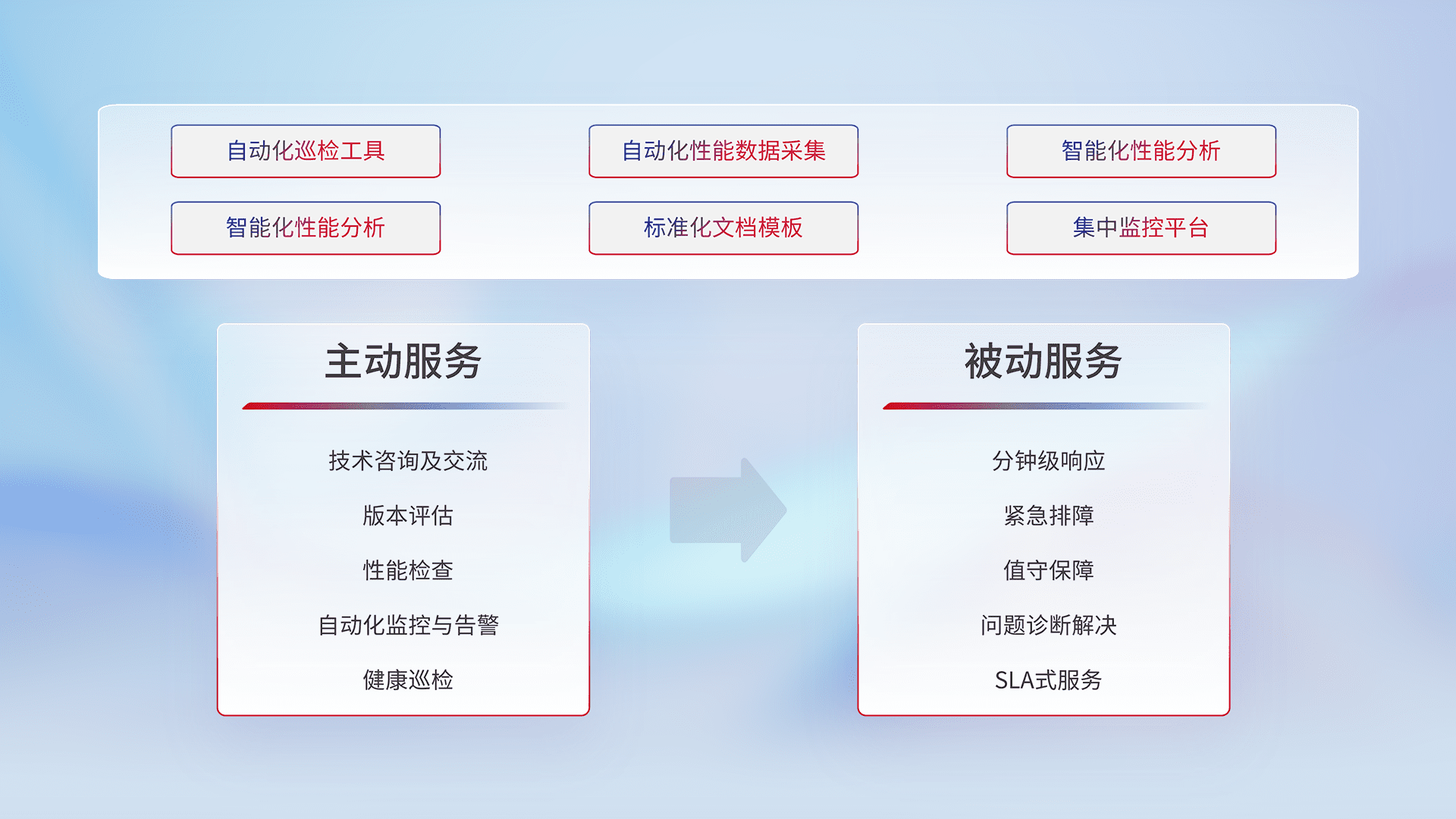 智能化工具和标准化文档,,,保障服务质量,,提供主动服务(包含技术咨询、、版本评估、、性能检查、、、自动化监控与告警、、健康巡检)和被动服务包含(分钟级响应、、、、紧急排障、、值守保障、、问题诊断解决、、、SLA服务)。。