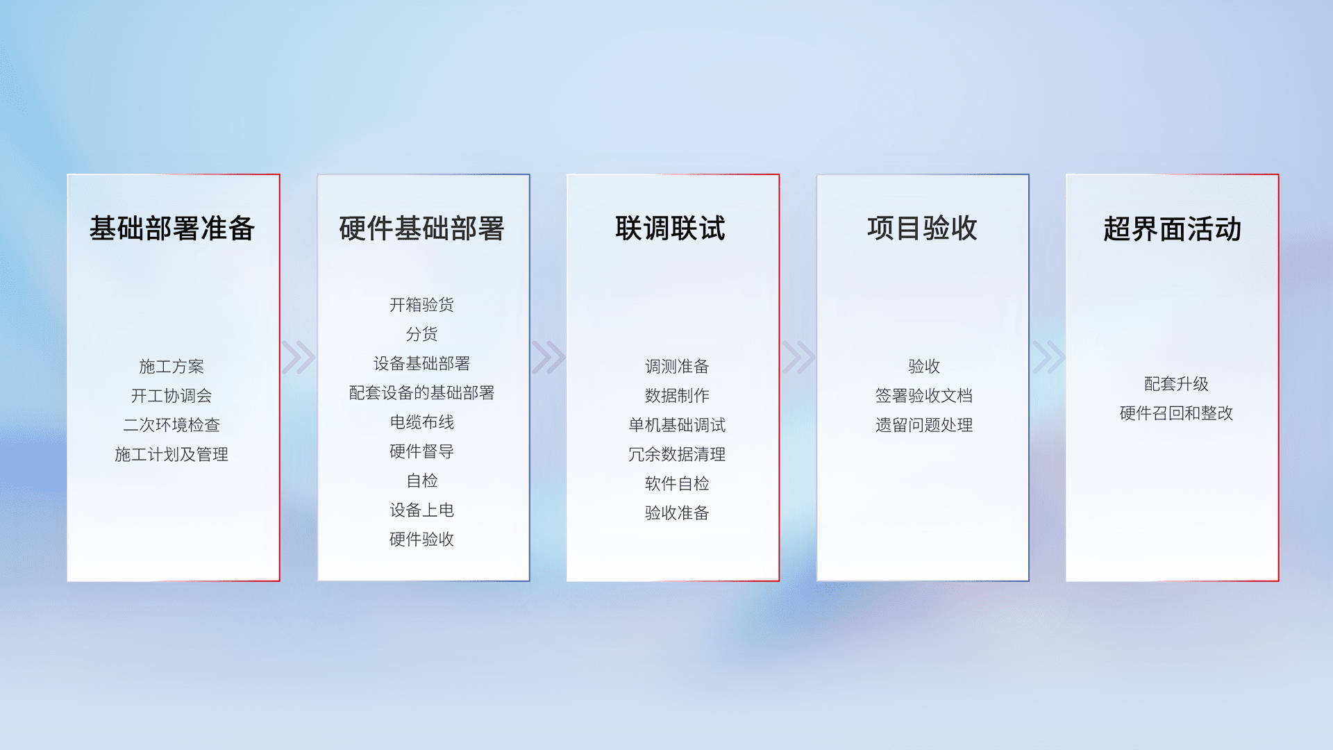 从基础部署准备、、硬件基础部署、、联调联试、、项目验收、、、越界面活动的全过程可追溯,,,保证施工质量和进度。。。