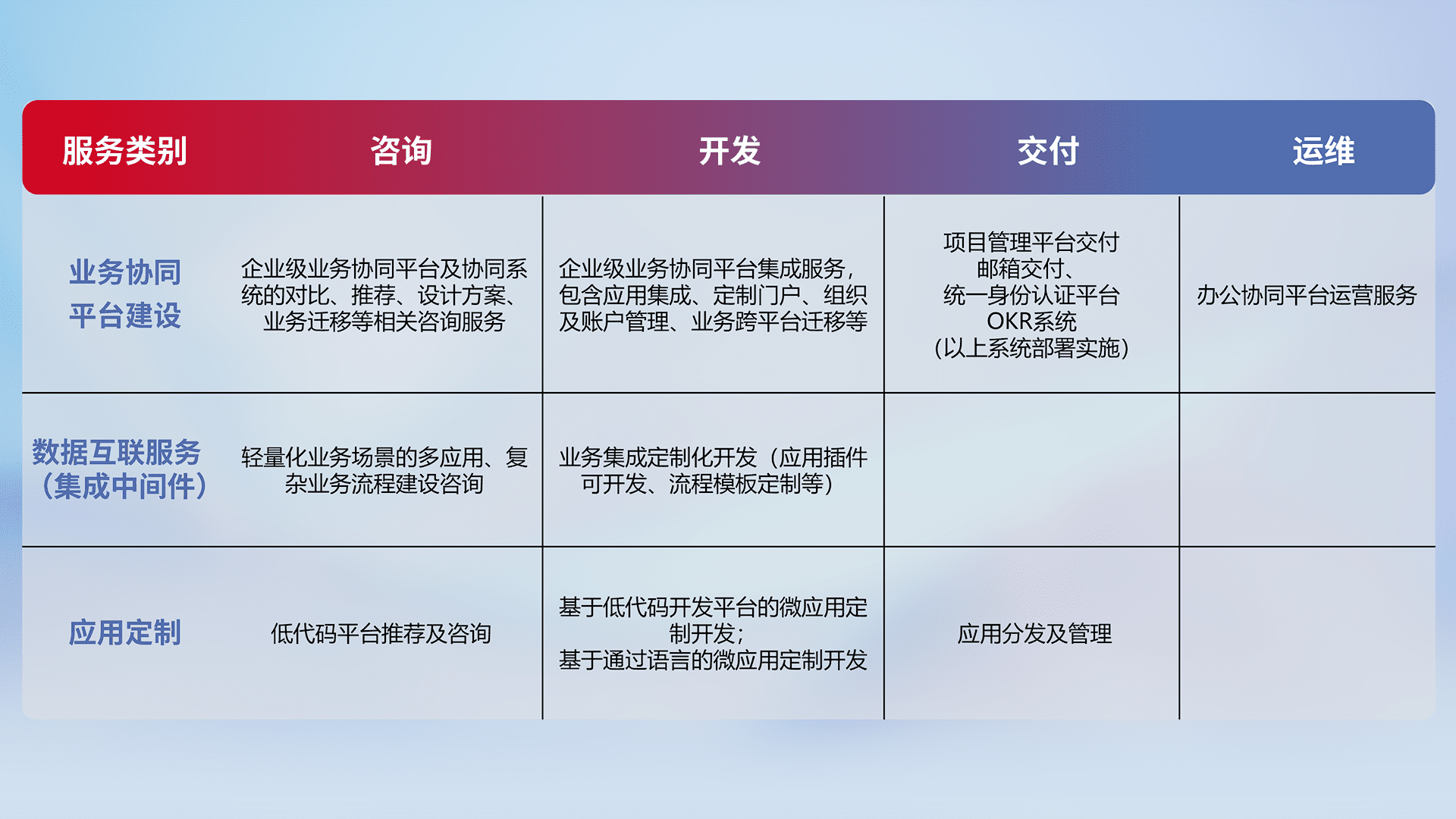 针对钉钉、、企微、、IDaas等平台级产品提供产品的规划、、、方案、、、、交付、、、定制化开发等服务,,,实现如统一协同办公、、、智能客户服务、、、混合会议管理、、、智能数据查询、、、等业务场景,,实现数字化转型。。。。